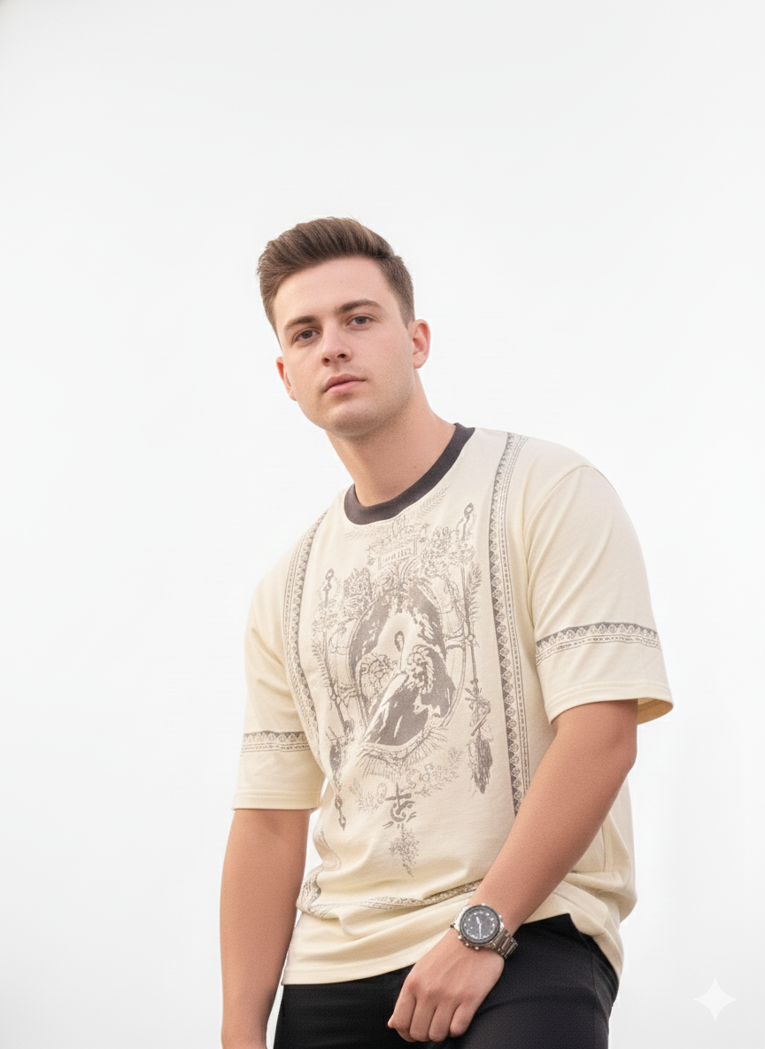 Design Description: A Vintage art design on the front, on the arms and on the back. The contradicting color of the collar adds unique style to the t-shirt adding a premium and unique look.